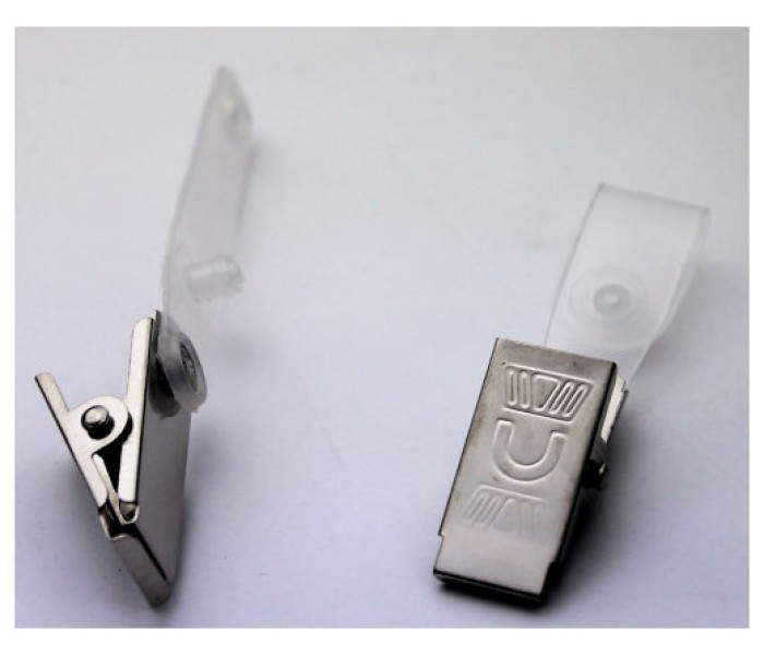 Pinza de sujeción para incluir en las fundas de identificación y tarjetas identificaticas rígidas, con pinza metálica y tira de cierre de botón.