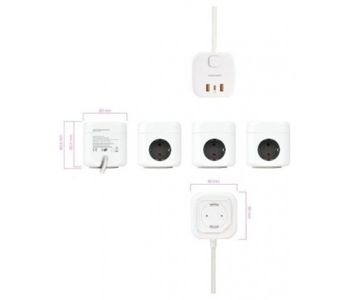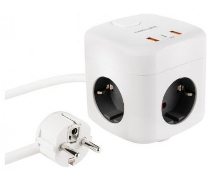 Regleta compacta en formato cubo con 3 enchufes de 16A y 3 puertos USB (2x USB-A + 1x USB-C).