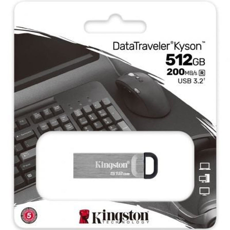 Kingston Technology DataTraveler Kyson. Capacidad: 512 GB, Interfaz del dispositivo: USB tipo A, Versión USB: 3.2 Gen 1 (3.1 Gen 1), Velocidad de lectura: 200 MB/s, Velocidad de escritura: 60 MB/s. Factor de forma: Sin tapa. Peso: 4 g. Color del producto: Plata
