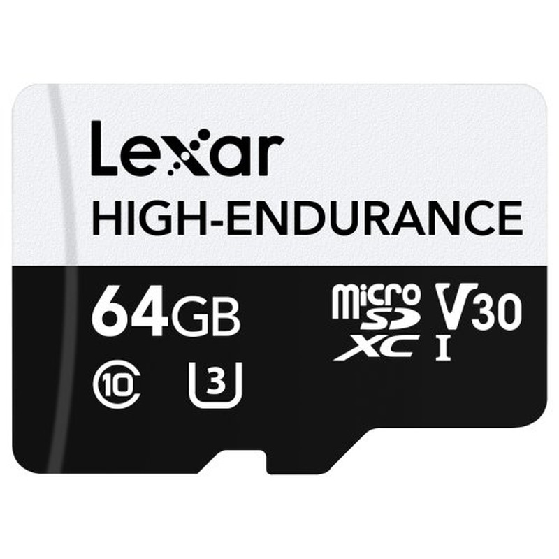 Lexar High-Endurance. Capacidad: 64 GB, Tipo de tarjeta flash: MicroSDXC, Clase de memoria flash: Clase 10, Tipo de memoria interna: UHS-I, Clase de velocidad UHS: Class 3 (U3), Clase de velocidad de vídeo: V30