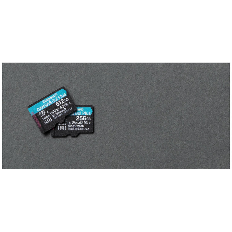 Kingston Technology Canvas Go! Plus. Capacidad: 256 GB, Tipo de tarjeta flash: MicroSD, Clase de memoria flash: Clase 10, Tipo de memoria interna: UHS-I, Velocidad de lectura: 170 MB/s, Velocidad de escritura: 90 MB/s, Clase de velocidad UHS: Class 3 (U3), Clase de velocidad de vídeo: V30. Funciones de protección: Resistente a golpes, Resistente a la temperatura, Resistente a las vibraciones, Resistente al..., Color del producto: Negro