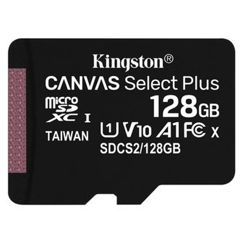 Kingston Technology Canvas Select Plus. Capacidad: 128 GB, Tipo de tarjeta flash: MicroSDXC, Clase de memoria flash: Clase 10, Tipo de memoria interna: UHS-I, Velocidad de lectura: 100 MB/s, Velocidad de escritura: 85 MB/s, Clase de velocidad UHS: Class 1 (U1), Clase de velocidad de vídeo: V10. Funciones de protección: Resistente a golpes, Resistente a las vibraciones, X-ray proof, Color del producto: Negro