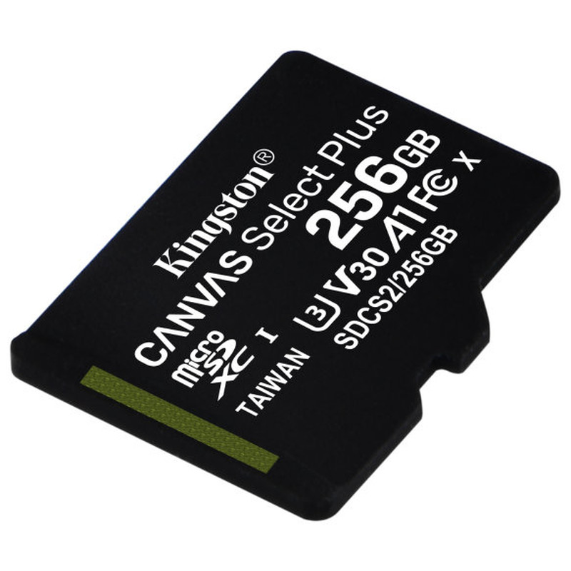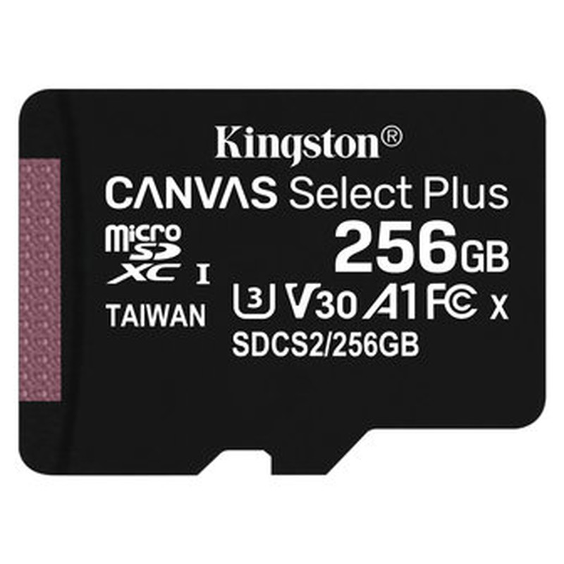 Kingston Technology Canvas Select Plus. Capacidad: 256 GB, Tipo de tarjeta flash: MicroSDXC, Clase de memoria flash: Clase 10, Tipo de memoria interna: UHS-I, Velocidad de lectura: 100 MB/s, Velocidad de escritura: 85 MB/s, Clase de velocidad UHS: Class 3 (U3), Clase de velocidad de vídeo: V30. Funciones de protección: Resistente a golpes, Resistente a las vibraciones, X-ray proof, Color del producto: Negro