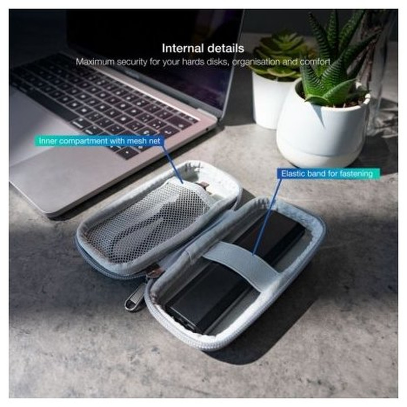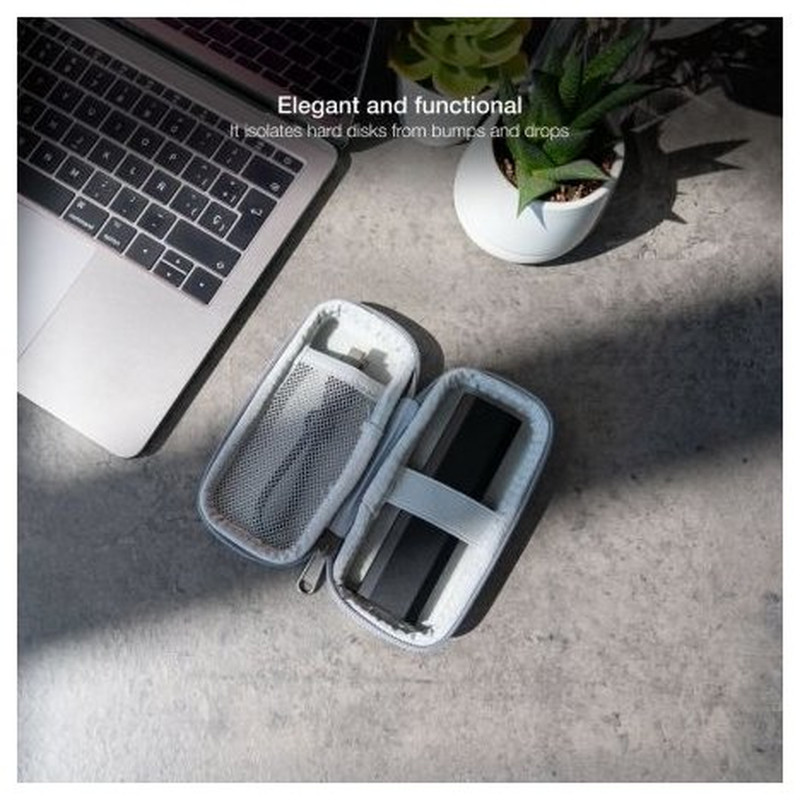 - Estuche compacto para guardar o transportar disco duro portátil.