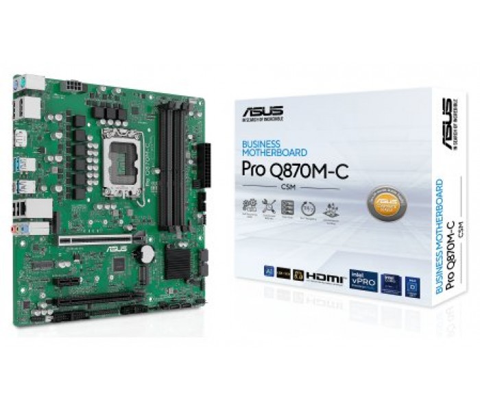 ASUS PRO Q870M-C-CSM. Fabricante de procesador: Intel, Socket de procesador: LGA 1851 (Socket V1), Procesador compatible: Intel Core Ultra (Series 2). tipos de memoria compatibles: DDR5-SDRAM, Memoria interna máxima: 256 GB, Tipo de ranuras de memoria: DIMM. Interfaces de disco de almacenamiento soportados: M.2, SATA III, Tipos de unidades de almacenamiento admitidas: HDD & SSD, Niveles RAID: 0, 1, 5, 10. Conector USB: USB tipo A, USB Tipo C. Tipo de interfaz ethernet: Gigabit Ethernet, Controlador LAN: Intel® I219-LM