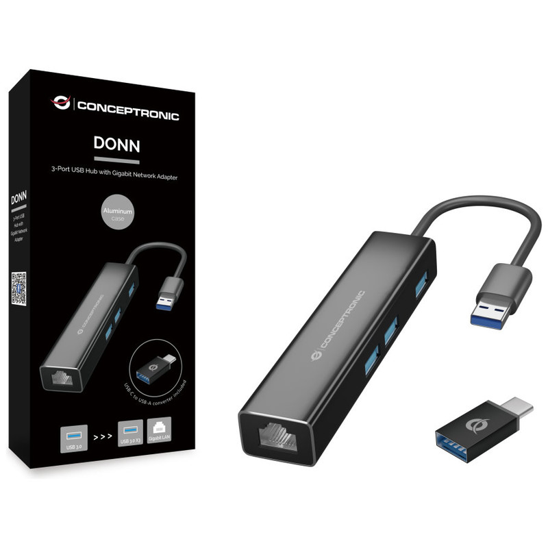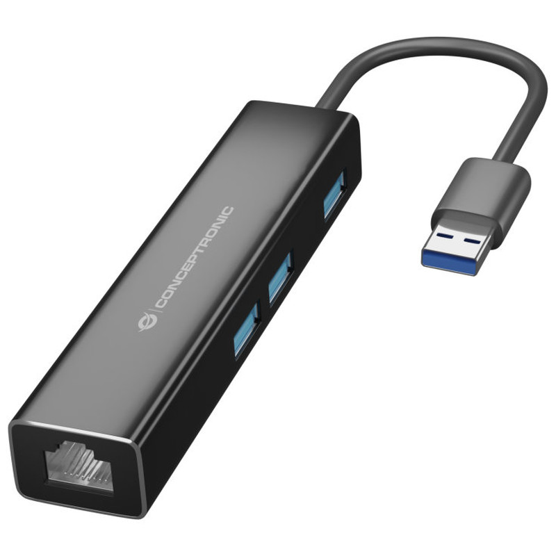 ADAPTADOR USB A GIGABIT ETHERNET RJ45 CONCEPTRONIC CON HUB USB 3.0 3 PUERTOS Y ADAPTADOR USB-C