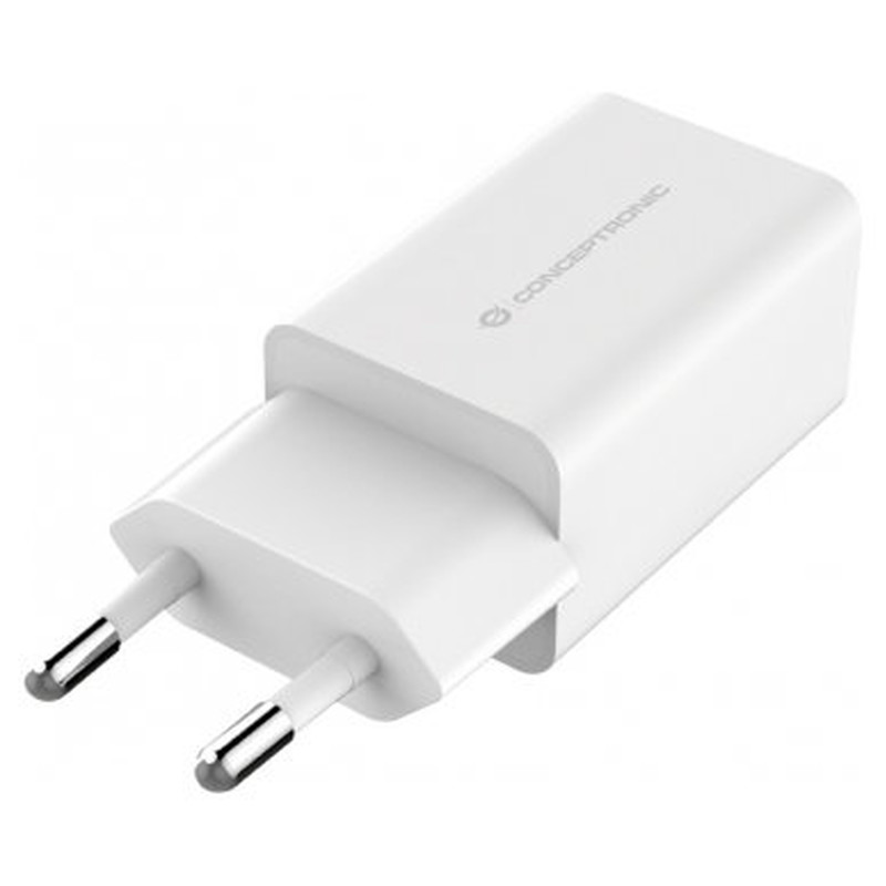 Este cargador USB de 2 puertos es la solución ideal para cargar su iPad o tableta, así como la mayoría de otros dispositivos que utilicen una conexión USB. Enchufándolo directamente a una toma de corriente, el cargador USB de 2 puertos puede trabajar con voltajes comprendidos entre 110 y 240 VCA, convirtiéndolos automáticamente a 5 VCC, que es el voltaje que utilizan los dispositivos USB. Además de teléfonos inteligentes y tabletas, el cargador admite muchos otros dispositivos, como por ejemplo sistemas de navegación, reproductores MP3 y cámaras digitales. Gracias a la alta potencia de salida y los 2 puertos USB, el versátil cargador USB de 2 puertos de Conceptronic puede cargar 2 dispositivos simultáneamente. Se trata de un elemento imprescindible para la oficina, el hogar y cuando viaja. ? Tipo de cargador: Interior ? Compatibilidad del cargador: Universal ? Alimentación: Corriente alterna ? Cantidad de puertos USB 2.0: 2 ? País de origen: China ? Color del producto: Blanco ? Conectar y usar (Plug and Play): ? Control de energía ? Voltaje de salida máximo: 5 V ? Corriente de salida de adaptador AC: 2.4 A ? Ancho: 31 mm ? Profundidad: 26 mm ? Altura: 50 mm ? Peso: 0.0385 g ? Cantidad por paquete: 1 pieza(s) ? Tipo de embalaje: Caja ? Ancho del paquete: 61 mm ? Profundidad del paquete: 28 mm ? Altura del paquete: 90 mm ? Peso del paquete: 0.1185 g