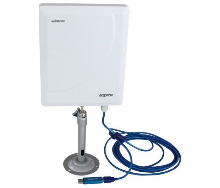 Si tienes problemas de cobertura con tu red inalámbrica y tu PC o portátil no logra recibir una buena señal Wi-Fi, este adaptador USB Wireless de doble banda es la mejor solución a tus problemas. Con la APPUSB26AC dispones de la potencia necesaria para conectarte de forma estable, interior o exteriormente a redes lejanas.. Características:. Utilidad del Producto. El adaptador USB inalámbrico 600 Mbps APPUSB26AC le permitirá conectar su ordenador o portátil a una red inalámbrica de doble banda y acceder a ella a 150 Mbps en 2,4GHz y a 433Mbps en 5GHz.. Es compatible con los protocolos IEEE 802.11b/g/n/ac y ofrece una señal inalámbrica estable. Todo ello lo convierte en el mejor aliado para jugar online o reproducir vídeo HD en streaming.. Diseño pensado para exteriores con cable USB de 5m. Investigación y desarrollo para crear un diseño estanco, ergonómico y funcional.. Además facilita la recepción de la señal en todos los entornos, y aporta estabilidad.. USB Booster garantiza un funcionamiento estable. Este dispositivo incluye un adaptador usb, llamado Usb Booster el cual es un amplificador de corriente que garantiza que su funcionamiento sea estable, ya que compensa las perdidas por cable usb deribadas de su longitud y ofrece una estabilidad y velocidad garantizada.. Realtek 8811AU y PCB de primera calidad. De los chipsets mas potentes del mercado, es la mejor solución de doble banda para tu red wifi y aportar estabilidad a tu red inalámbrica.. Adaptador de gran potencia y antena PANEL de 26dBi. Potencia máxima para alcanzar las redes mas lejanas con tecnología interna en la antena de panel.. Especificaciones:. • 802.11 b / g / n / ac. • Hasta 150Mbps 2.4GHz. • Hasta 433Mbps 5GHz. • Soporta encriptación WPA-PSK /. • WPA2-PSK WPA / WPA2 64/128 bit. • Cable USB 5m. • Para uso interior y exterior