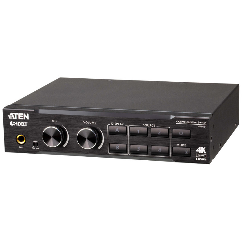 El VP1421 es un completo conmutador de presentación que integra una matriz de vídeo, un escalador 4K real, un extensor HDBaseT, un DSP de audio y funciones de conversor de señal analógica a digital en un único dispositivo compacto, ideal para salas de reuniones y espacios educativos.4K real, claridad visual HDRAdmite resoluciones de hasta 4096 x 2160 a 60 Hz (4:4:4) y HDR para ofrecer contenido vivo en todas las presentaciones.Conmutación AV fluida escalada hasta la perfecciónConecte hasta 4 fuentes (1 HDBaseT, 2 HDMI, 1 VGA), conmute sin problemas entre ellas y visualice contenido escalado a la perfección a 4K real y 1080p de forma simultánea.Transmisión extendida HDBaseT a través de un cableSimplifica el cableado y transmite AV, alimentación y señales de control mediante infrarrojos y RS-232 bidireccionales a una distancia de hasta 140 m a través de cables de Cat 6/6a o de Cat 6 ATEN 2L-2910 (se aplica tanto a puertos de entrada como a puertos de salida HDBaseT).DSP de audio avanzado integradoAdmite entrada de micrófono con alimentación fantasma de 48 V y permite que la entrada de micrófono se mezcle con el audio del programa y se incruste en la salida de la pantalla a la vez que se reduce automáticamente el audio del programa para mejorar la audibilidad de los diálogos.Incrustación / desincrustación de audio flexibleAdmite la incrustación de audio estéreo en la salida HDMI o la separación en salida de línea de audio y salida de audio óptica. Extraiga el audio HDMI y HDBaseT a diferentes salidas de audio también con el fin de facilitar la adaptación a la configuración de audio que prefiera.Control versátil y funcionamiento optimizadoControl a través de los pulsadores del panel frontal, mando a distancia por infrarrojos, GUI basado en web y cualquier interfaz de control a través de RS-232, Ethernet y cierre de contacto para optimizar sus operaciones.