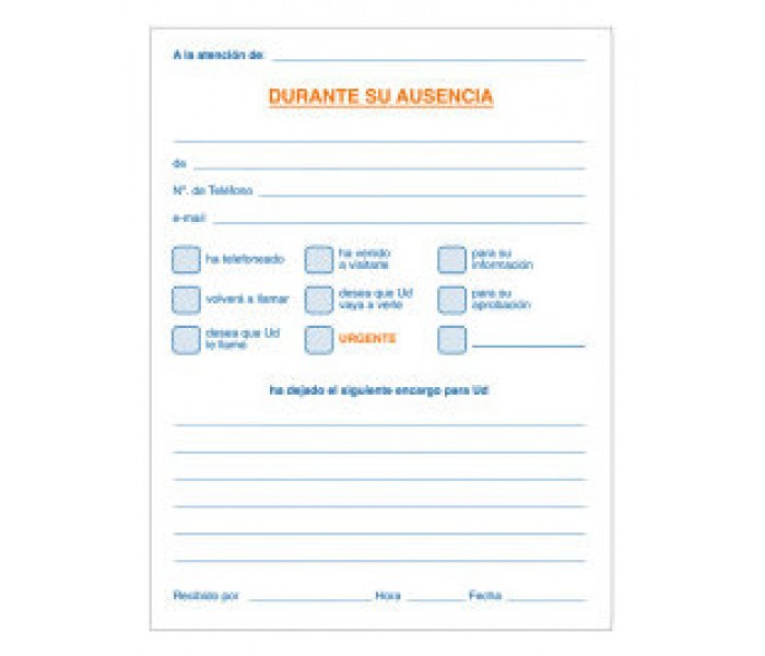 Talonarios con 100 hojas preimpresas a dos tintas para registro y avisos de llamadas. Tamaño octavo natural. Sencillo (sólo original). Con certificado FSC.