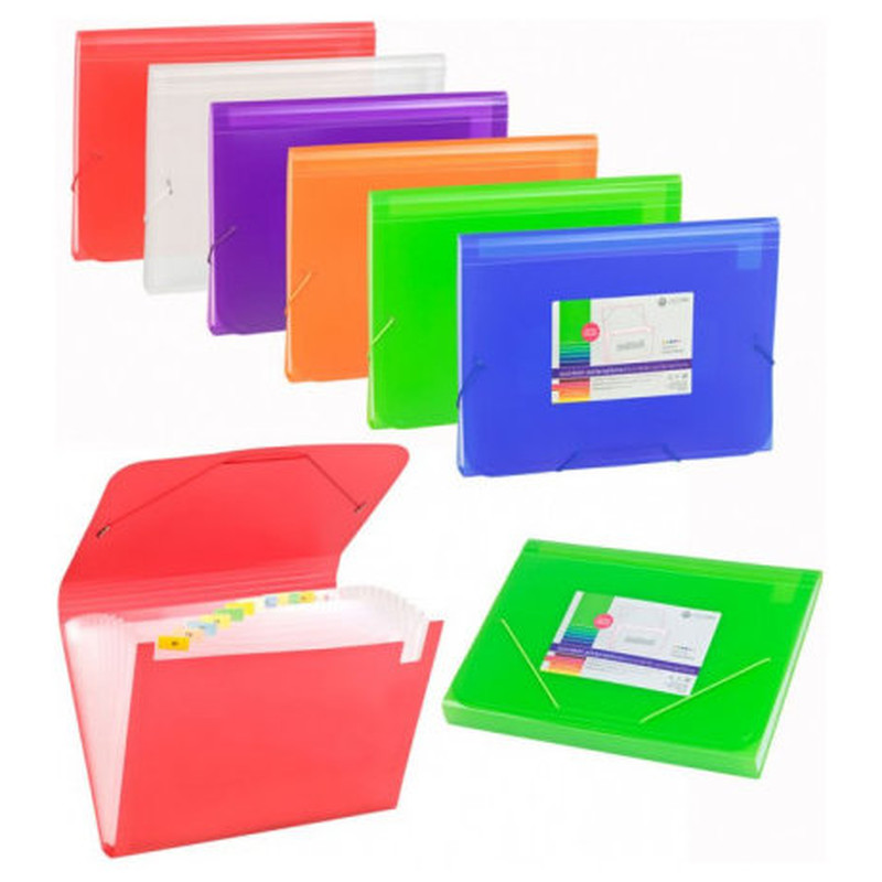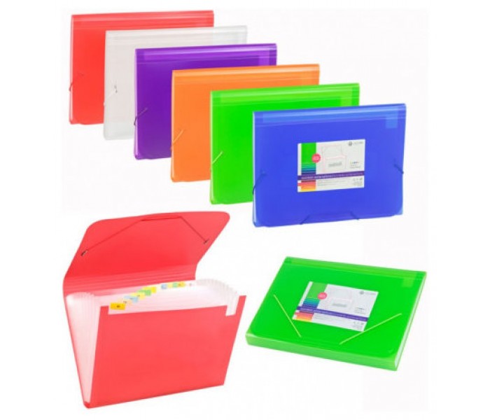Polipropileno traslúcido 13 departamentos con fuelle. Elástico redonde de cierre. Tamaño "Folio".