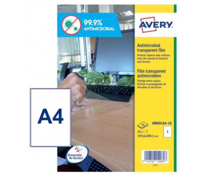 CAJA DE 10 HOJAS (1 ETIQ.XHOJA) ADHESIVAS ANTIBACTERIANAS Y ANTIMICROBIANAS POLIÉSTER TRANSPARENTE TAMAÑO 199,6X289,1MM AVERY AM001A4