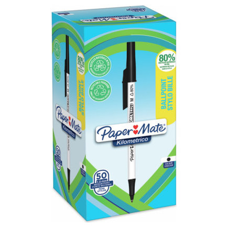 CAJA 50 BOLÍGRAFOS PAPER MATE KILOMÉTRICO PUNTA MEDIANA (1,0MM) TINTA NEGRA 80% PLÁSTICO RECICLADO PAPER MATE 2187701