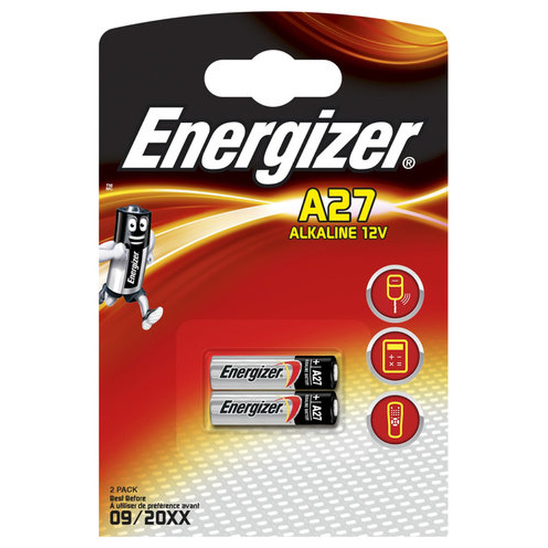 Energizer alkaline battery, model A27, 12 Volt. 2 Batteries in blister pack. Equivalent models: E27A, V27A, V27PX, V27GA, L728, L828, MN27, G27A, GP27A, WE27A, CA22, UM27A, LR27A, K27A, 27AE, A27S.