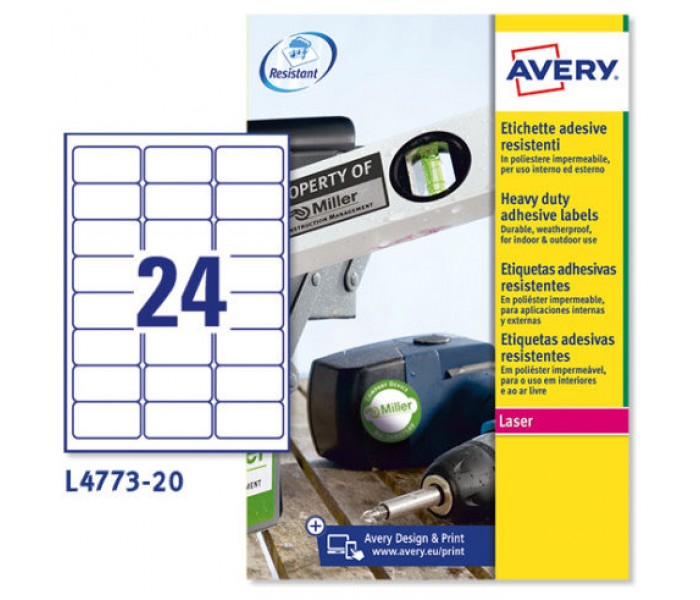 Avery White Heavy Duty Labels - Laser - L4773. Color del producto: Blanco, Tecnología de impresión: Laser. Hojas de medios por paquete: 20 hojas. Tamaño de medio (1 diapositiva): 64.6 x 33.8 mm