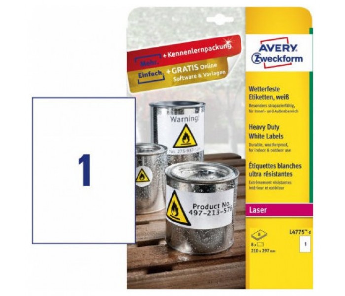 PAQUETE 8 HOJAS ETIQUETAS DE POLIÉSTER BLANCO-IMPRESORAS LÁSER-210X297 MM AVERY L4775-8