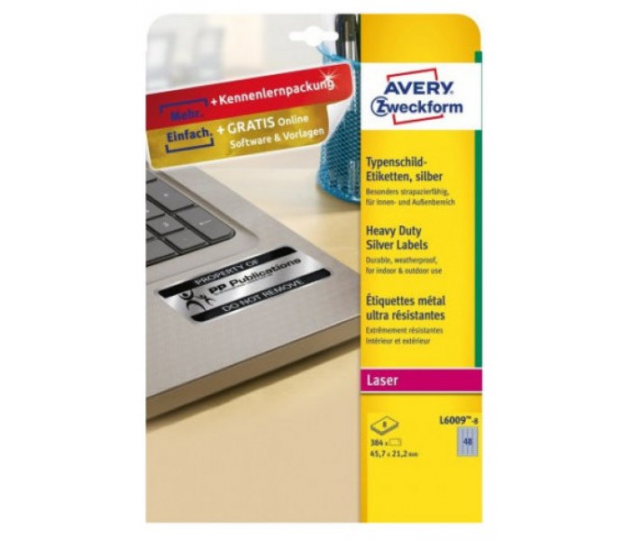 Avery L6009-8. Color del producto: Plata, Tipo de etiqueta: Etiqueta para impresora autoadhesiva, Formato: A4. Anchura de etiqueta: 4,57 cm, Altura de etiqueta: 2,12 cm. Etiquetas por paquete: 384 pieza(s), Hojas de medios por paquete: 8 hojas