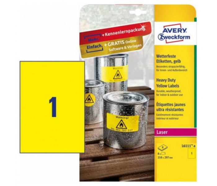 PAQUETE 8 HOJAS ETIQUETAS AMARILLAS DE POLIÉSTER-IMPRESORAS LÁSER-210 X 297 MM AVERY L6111-8