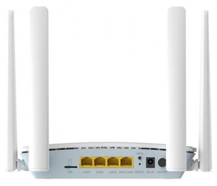 - Interfaces del dispositivo: 3 puertos LAN Fast Ethernet, 1 puerto WAN/LAN Fast Ethernet, botón WPS, botón Reset, botón de encendido, ranura para tarjeta SIM Nano (4FF), conector de alimentación