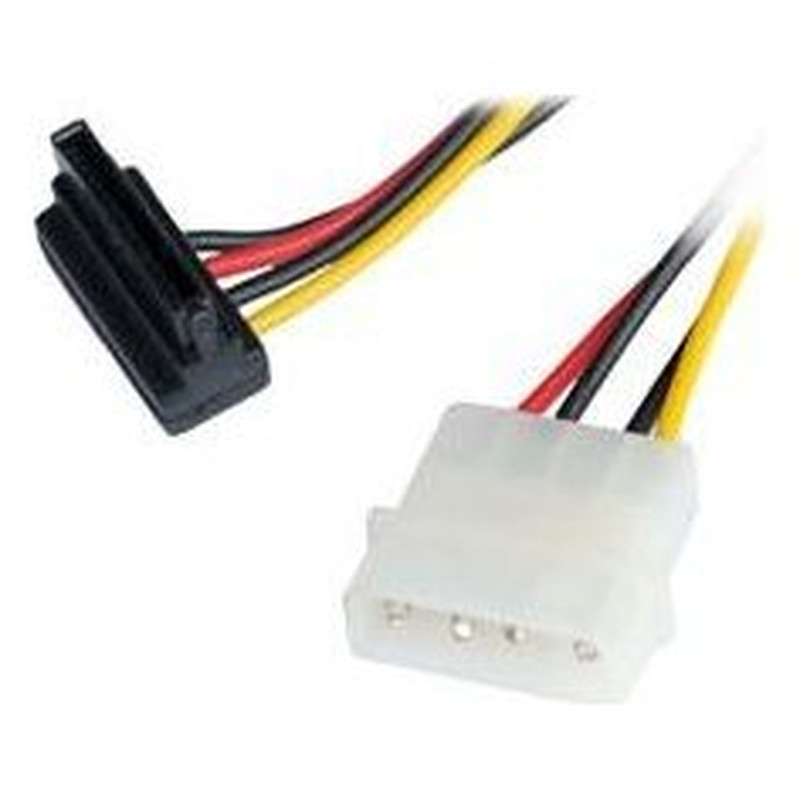 Conector molex 4 pin macho en un extremo y conector sata alimentacion acodado hembra en otro.
