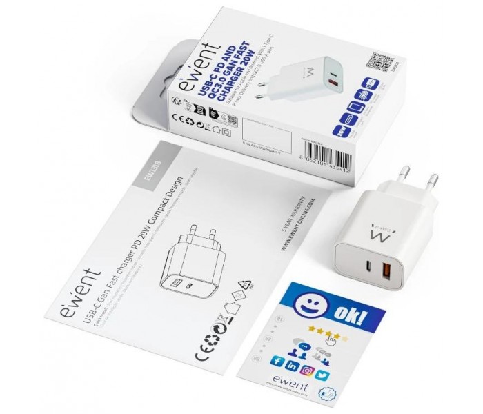 EWENT EW1318 Cargador rápido USB-C PD 20W USB-A QC