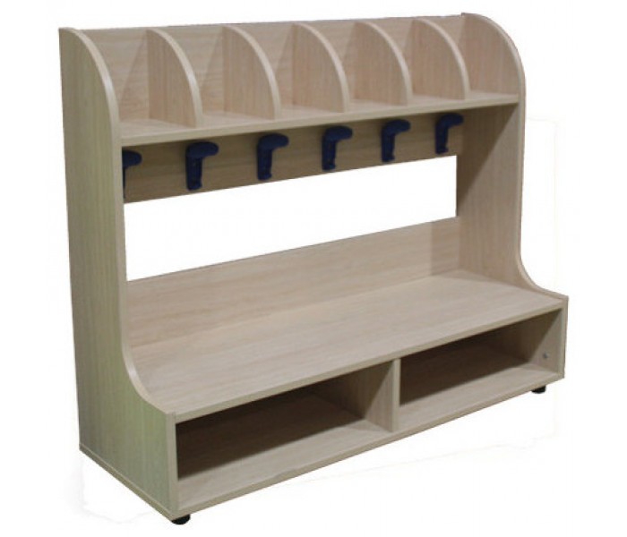 Mueble con banco en la zona inferior y perchero con 6 casillas en la zona superior, fabricado en melamina de haya, con tableros de 19 mm de espesor y con cantos en PVC de 2 mm. Acabado por las dos caras. Dispone de 6 perchas fabricadas en polipropileno con aristas redondeadas y sistema doble colgador, para poder colgar la vestimenta del niño. Pies niveladores de PVC de 4 cm de altura, para evitar la humedad y desniveles que pueda tener el suelo.Garantizado por los ensayos realizados en centro tecnológico de certificación de mobiliario TECNALIA.