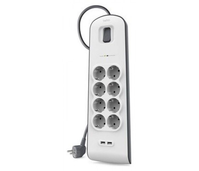 PROTECCIÓN DE OCHO ENCHUFES CON DOS PUERTOS USB Mantén tus dispositivos electrónicos protegidos de los peligrosos picos de tensión y las sobretensiones con el protector contra sobretensiones de Belkin con 8 enchufes y 2 puertos USB. Simplemente enchufa el protector en cualquier toma de corriente de pared CA y conecta hasta ocho dispositivos CA y dos dispositivos USB para protegerlos contra picos de tensión, rayos y contaminación CA. Ideal para televisiones, equipos de música, descodificadores, reproductores multimedia u otro equipamiento de cine en casa la regleta de protección contra sobretensiones de Belkin está diseñada con una construcción de alta calidad y un sistema de circuitos superior. Ofrece una protección máxima contra el daño eléctrico para tus dispositivos y datos más valiosos. DOS PUERTOS DE 2,4 AMPERIOS PARA CARGA Carga tus dispositivos portátiles rápidamente a la vez que los proteges contra cualquier daño y pérdida de datos gracias a los dos puertos USB integrados. Ideales para smartphones y tabletas estos puertos USB cargan a 2,4 amperios. Esto ofrece unos tiempos de carga más veloces que los puertos USB tradicionales con protección añadida. PROTECCIÓN CONTRA SOBRETENSIONES DE HASTA 900 JULIOS RESISTENTE CABLE DE CORRIENTE DE 2 METROS ? Protege a dispositivos de cine en casa de los daños producidos por sobretensiones y picos de corriente. ? Ideal para televisiones, equipos de música, descodificadores y otro equipamiento de cine en casa. ? Ocho enchufes CA protegidos y dos puertos USB de 2,4 amperios. ? El robusto cable de corriente de 2 metros facilita un emplazamiento de la regleta de protección cómodo y sin que suponga un obstáculo. ? La carcasa antidaños protege a los circuitos contra el fuego, los impactos y la corrosión. ? Clasificado para resistir una sobretensión de corriente de hasta 900 julios. ? Protección CA de tres conductores contra sobretensiones entre líneas positivas, neutras y de tomas de tierra.