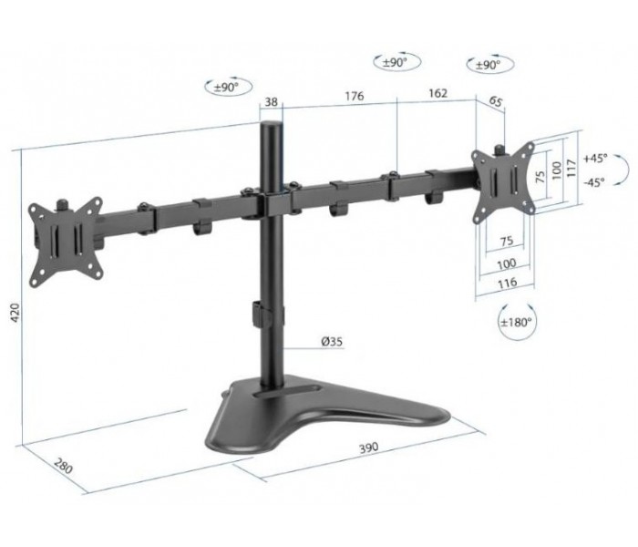| Características | - Soporte de sobremesa para 2 monitores - Tamaños de monitores soportados: 13" (mín) - 32" (máx) VESA mínimo: 75 x 75 mm VESA máximo: 100 x 100 mm - Peso máximo soportado: 8 kg por monitor - 16 kg (máx) - Ajustable en altura, inclinación, rotación y giro: Altura: 2 cm ~ 46 cm Inclinación: +45° ~ -45° Rotación: +180° ~ -180° Giro: +90° ~ -90° - Color: negro - Peso neto: 3,74 kg - Base sólida y estable con ranura para móvil - Sistema integrado de guiado de cables y almacenamiento de llaves Allen - Incluye manual, tornillería e instrucciones de instalación - Cumple especificaciones RoHS |