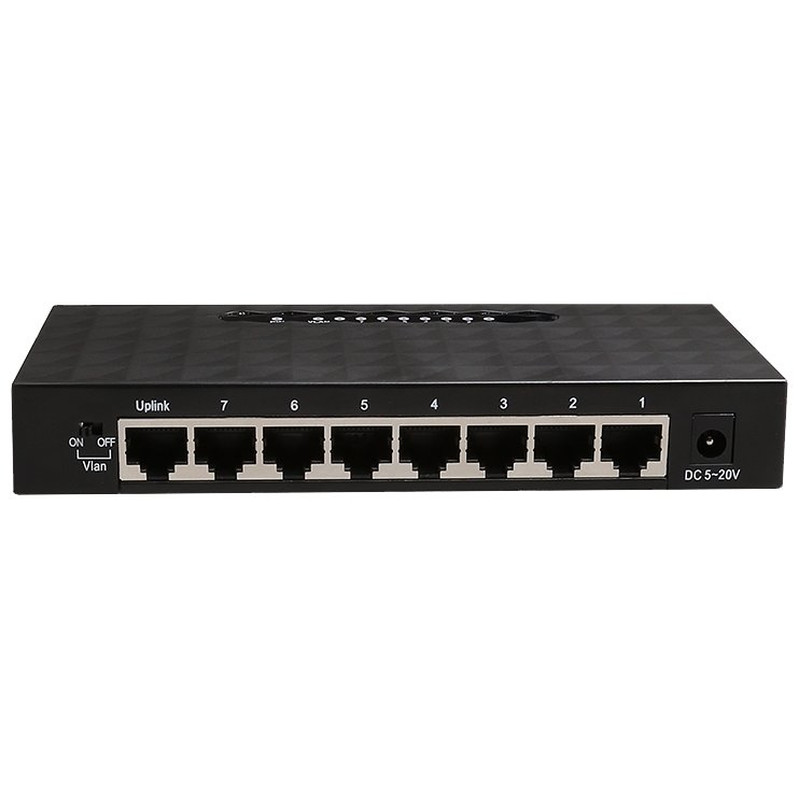 | Características | - Estándares: IEEE 802.3, IEEE 802.3u, IEEE 802.3ab - Interfaces: 8 puertos RJ45 x 10/100/1000 Mbps - Cableado de red (UTP): 10BASE-T (CAT3,4,5) 100BASE-TX (CAT5,5e) 1000BASE-T (CAT5e,6) - Auto negociación - Auto MDI/MDIX - Técnica de conmutación: almacenamiento y reenvío - Capacidad de conmutación total: 16 Gbps - LEDs: 8 individuales, 1 general y 1 x VLAN (8 + 2) - Corriente de entrada: 5.0V - 1.0A |