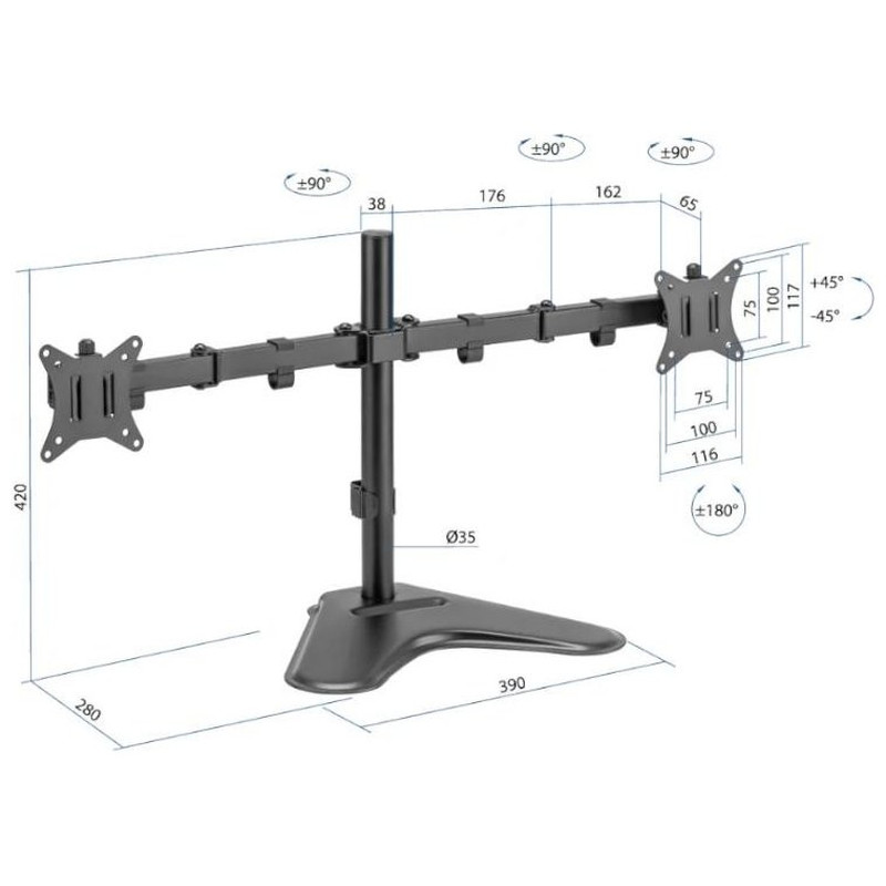| Características | - Soporte de sobremesa para 2 monitores - Tamaños de monitores soportados: 13" (mín) - 32" (máx) VESA mínimo: 75 x 75 mm VESA máximo: 100 x 100 mm - Peso máximo soportado: 8 kg por monitor - 16 kg (máx) - Ajustable en altura, inclinación, rotación y giro: Altura: 2 cm ~ 46 cm Inclinación: +45° ~ -45° Rotación: +180° ~ -180° Giro: +90° ~ -90° - Color: negro - Peso neto: 3,74 kg - Base sólida y estable con ranura para móvil - Sistema integrado de guiado de cables y almacenamiento de llaves Allen - Incluye manual, tornillería e instrucciones de instalación - Cumple especificaciones RoHS |