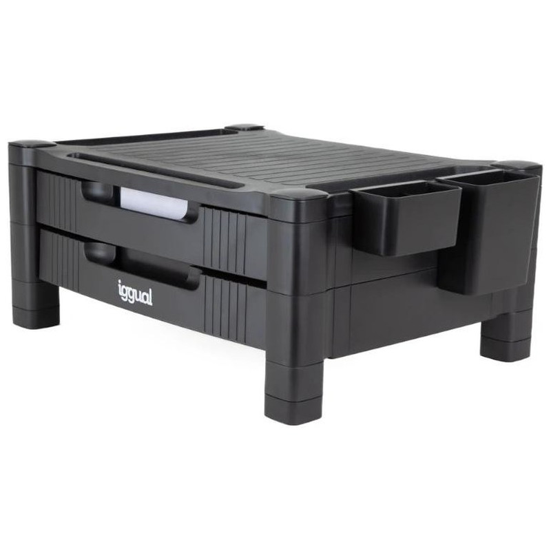 | Características | - Soporte elevador de monitor con patas - Elevable - Ranura delantera para tablet y móvil - 2 cajones frontales - 2 huecos laterales - 2 gavetas laterales extra - 4 separadores internos - Peso máximo soportado: 30 kg - Altura mínima: 13 cm - Altura máxima: 19 cm - Superficie de apoyo: 45,7 x 33 cm |