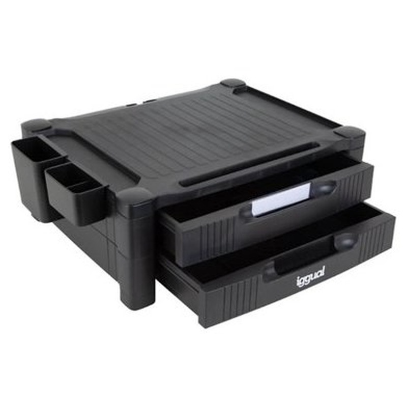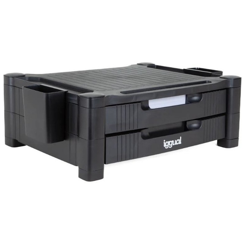 Eleva tu monitor, mejora el visionado, minimiza esos dolores de cuello, hombros y espalda, y organiza mejor tu espacio de trabajo con el elevador de monitor de dos cajones EM2C de iggual.