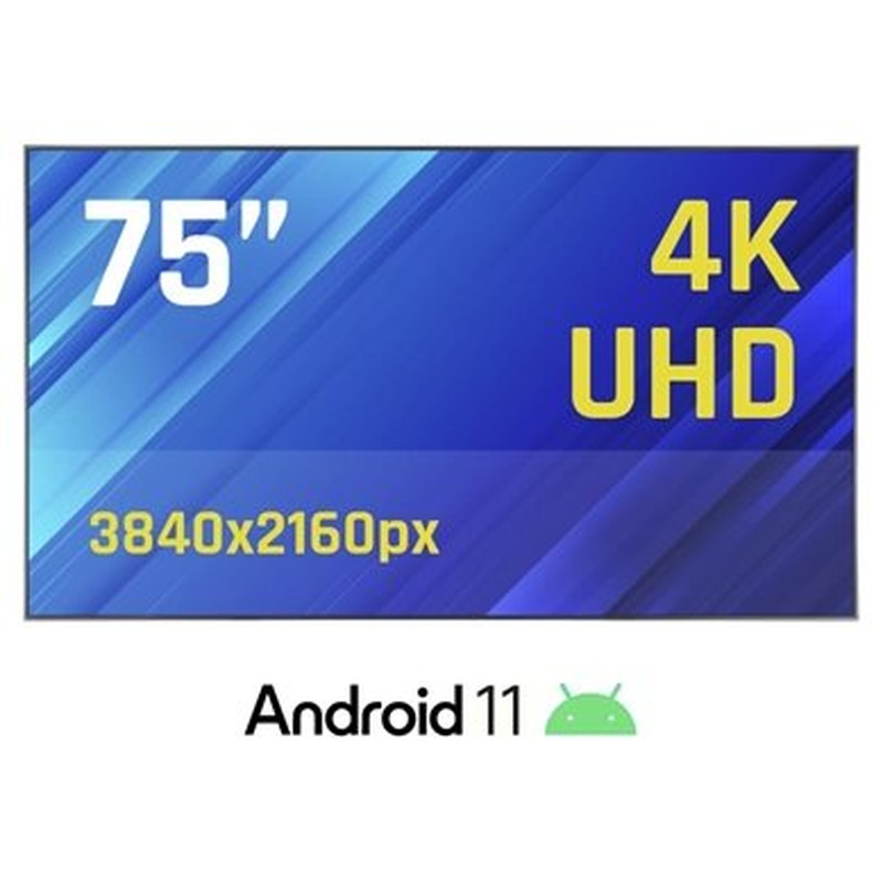 | Características | Display - Pantalla interactiva 4K de 75" - Tecnología de visualización: DLED (retroiluminación directa mediante LED) - Relación de aspecto: 16:9 - Resolución: 4K UHD 3840 x 2160 px - Área activa: 1650x928 mm - Colores: 16,7 millones - Frecuencia: 60 Hz - Brillo: 1.500 cd/m2 - Contraste: 1200:1 - Tiempo de respuesta: 6 ms - Ángulo de visión: 178º(H) / 178º(V) - Webcam integrada: no - Micrófonos integrados: no - Táctil: no CPU y SO - Procesador de 4 núcleos A55 - 2,0 GHz - Sistema operativo: Android 11 - Memoria RAM: 2 GB - Memoria ROM: 32 GB - Temperatura de trabajo: 0ºC-40ºC Conectividad 1 x HDMI (in) 2 x USB-A 3.0 1 x tarjeta TF 1 x tarjeta SIM 1 x RJ45 1Gb/s (in) 1 x mini jack 3,5 mm audio Conexiones inalámbricas WiFi 6: Banda dual IEEE 802.11 a/b/g/n/ac/ax 2,4 GHz - 5 GHz (1 conector WLAN RP-SMA trasero + 1 antena) Bluetooth 5.0 Alimentación y consumo - Consumo: 460W - Modo en espera (standby): <0,5W - Tensión de entrada: AC 100-240V 50/60 Hz - Altavoces integrados: 2 x 5W / 8Ω Medidas y pesos - Tamaño total: 1668 x 948 x 66 mm - Peso neto: 30,2 kg - Tamaño packaging: 1840 x 1145 x 225 - Peso bruto: 38,8 kg - VESA: 600 x 400 Accesorios - 1 x Cable de alimentación - 1 x Mando de control remoto - 1 x Soporte de pared (fijo) |