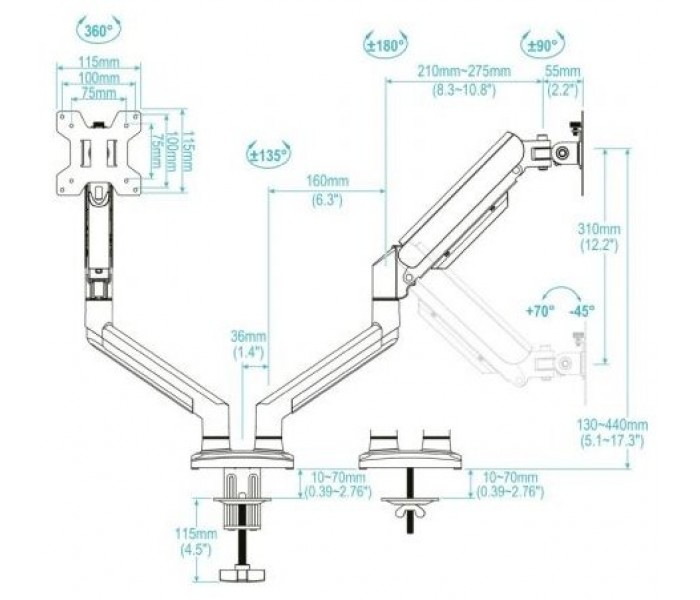 • Peso soportado de pantalla: Mínimo 2 kg, Máximo 10 kg por cada brazo