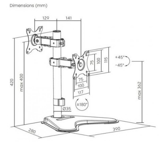 • Tipo: Soporte de mesa inclinable y rotable para 2 monitores/POS (1 pivote, 2 brazos) de 17”-32”