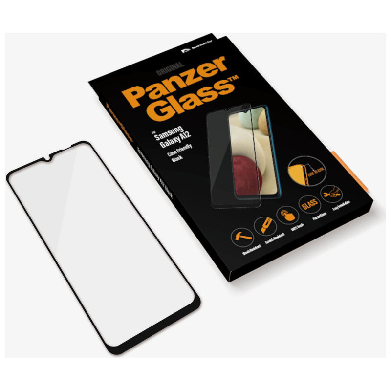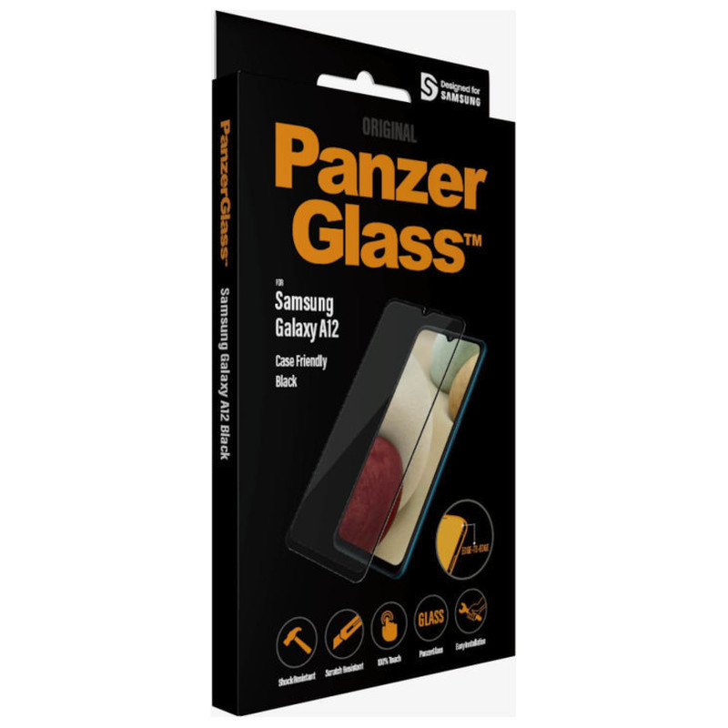 El protector de pantalla PanzerGlass ™ para Samsung Galaxy A12 en negro se adapta a las carcasas y cubre toda la superficie de la pantalla. Le proporciona el más alto estándar de protectores de pantalla, al tiempo que conserva el 100% de sensibilidad táctil. Para reflejar el tacto y la sensación de la pantalla original, PanzerGlass ™ está recubierto con una capa oleofóbica, que es a la vez antibacteriana y antihuellas.