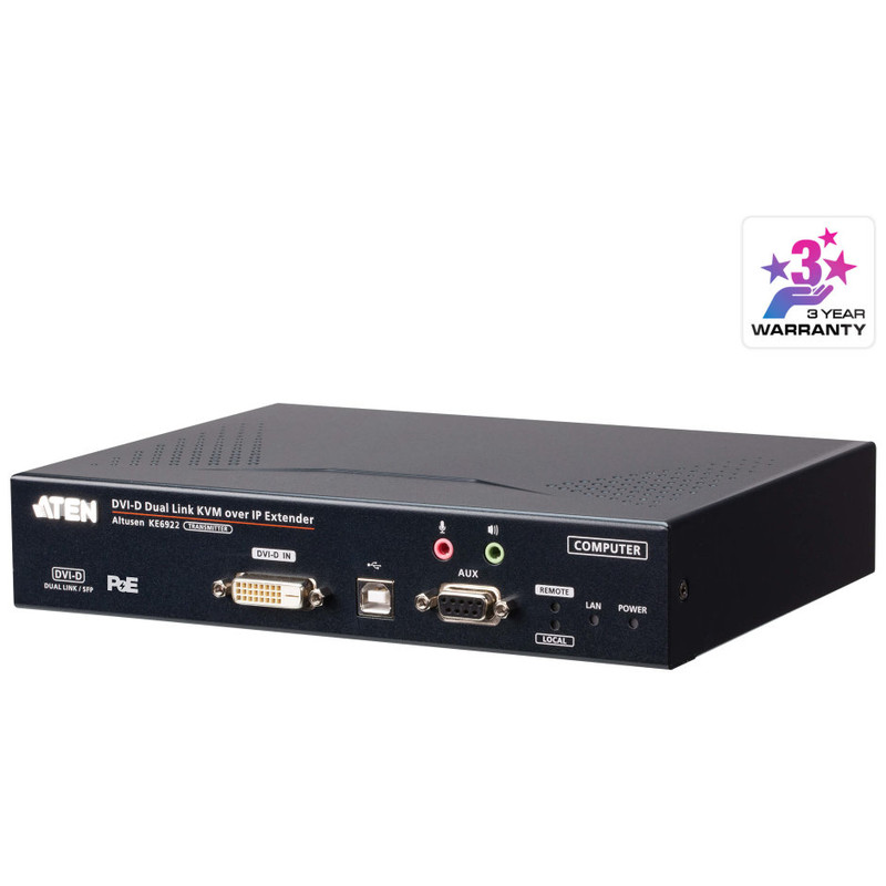 El KE6922 es un extensor basado en IP formado por un transmisor (KE6922T) y un receptor (KE6922R). El transmisor se conecta a un ordenador para enviar los datos del ordenador al receptor para ofrecer de forma conjunta acceso a la consola desde una ubicación remota o independiente. El KE6922 permite extender el acceso a sistemas informáticos situados en una ubicación remota mediante consolas USB (teclado USB, ratón USB, monitor DVI) a través de la intranet, lo que permite a los usuarios ubicar el sistema informático en un entorno seguro y con una temperatura controlada, el cual pueden estar aislado de las estaciones de trabajo de los usuarios.1x transmisor de KVM de enlace dual DVI-D 2K KE6922T a través de IP con SFP y PoE1x LIN5-36W1-W11G cable KVM (DVI-D, enlace dual, USB, audio; 1,8 m/6 pies)1x juego de almohadillas para la base (4 unidades)1x KC06-0040-200G kit de montaje1x manual de instrucciones