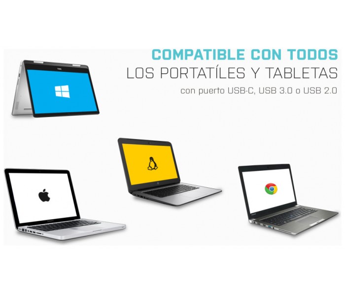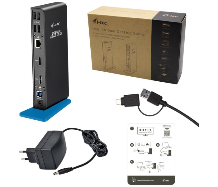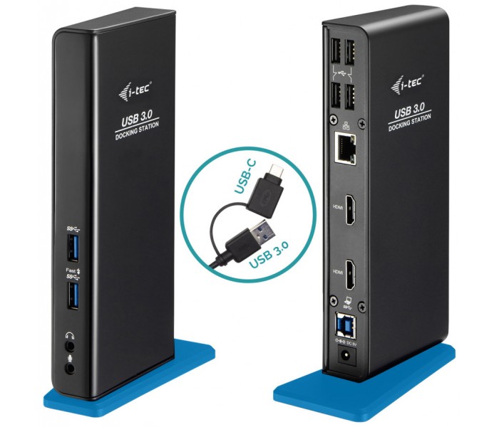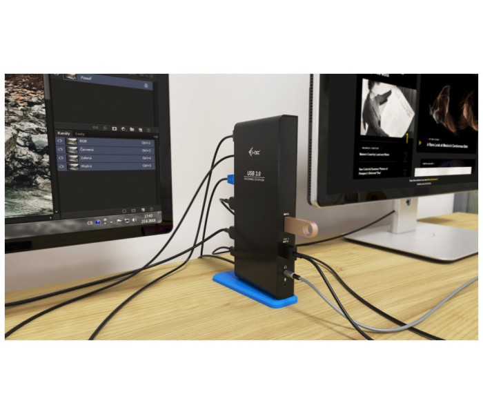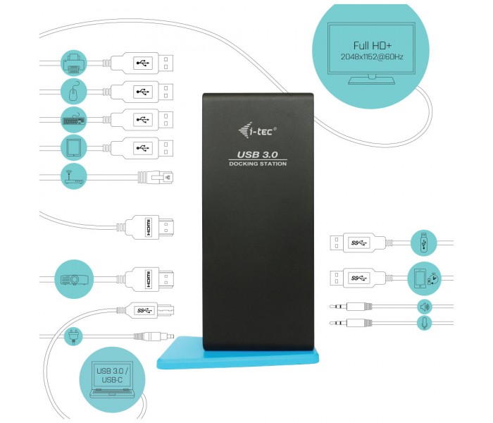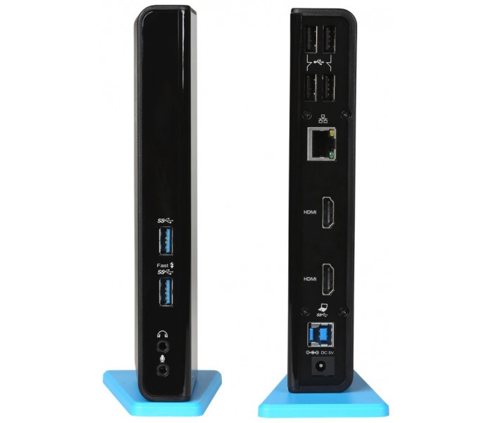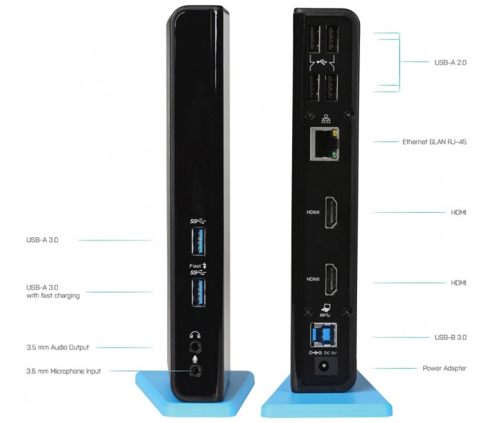 Estación de almacenamiento universal que se puede usar prácticamente con cualquier notebook, ya que se puede conectar con cualquier puerto USB (USB 3.0, USB-D, Thunderbolt 3, o hasta con el puerto USB 2.0 más antiguo).La estación soporta hasta 2 monitores externos que se conectan por medio de puertos HDMI. 6 puertos USB, conexión fiable y rápida con el internet, gracias al integrado puerto LAN, sin que falte el soporte de la salida y entrada de audio.La estación de almacenamiento se puede instalar en la posición vertical (exige menos espacio en la mesa de trabajo), u horizontal – en tal caso, puede servir de base cómoda de su notebook.