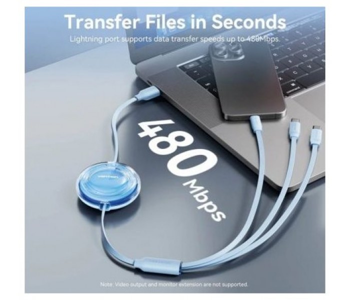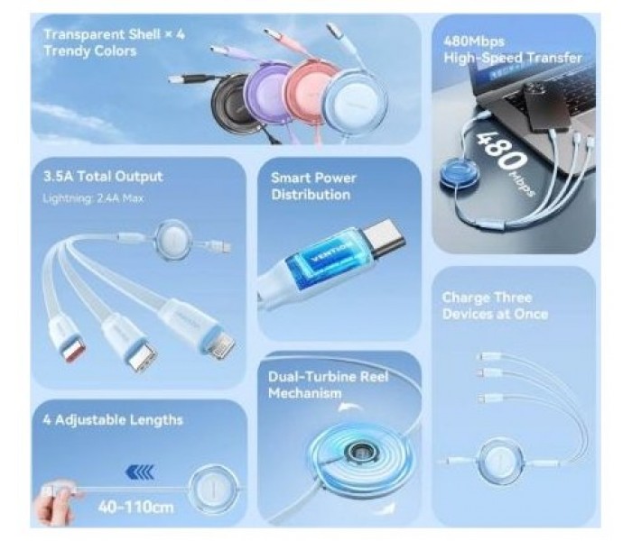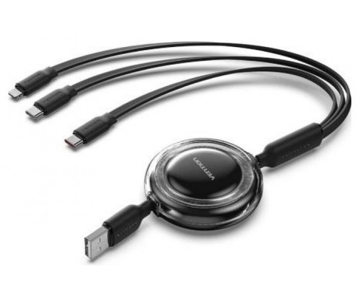 Cable USB Retráctil Vention TRJBBE/ USB Macho - Lightning/ 2xUSB Tipo-C/ Hasta 17.5W/ 10Gbps/ 1.1m/ Negro
